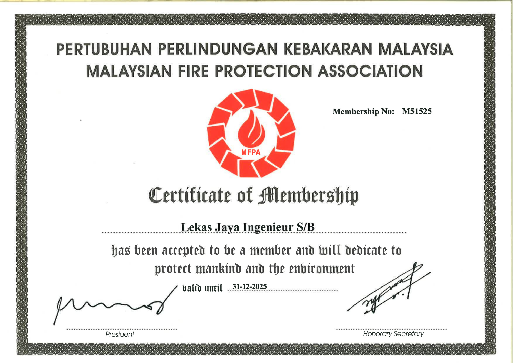 Lekas Jaya Ingenieur Sdn Bhd is a proud registered member of the Malaysian Fire Protection Association (MFPA), reflecting our commitment to upholding industry standards in fire safety and protection. This certification underscores our dedication to safeguarding people, property, and the environment through responsible engineering practices