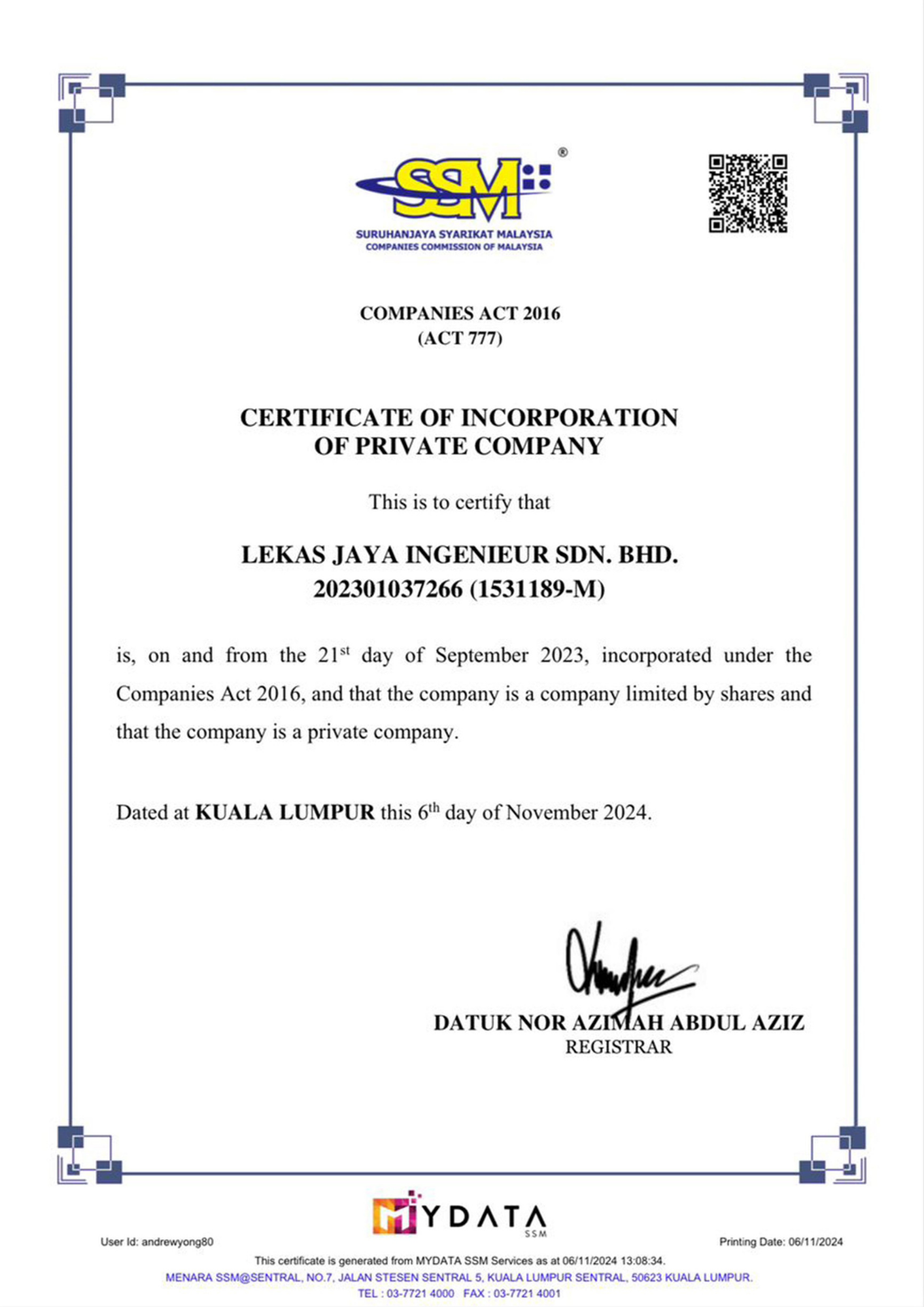 This certificate confirms that Lekas Jaya Ingenieur Sdn. Bhd. is officially incorporated as a private company under the Companies Act 2016. It serves as legal recognition of our establishment and authority to operate as a registered business entity in Malaysia.
